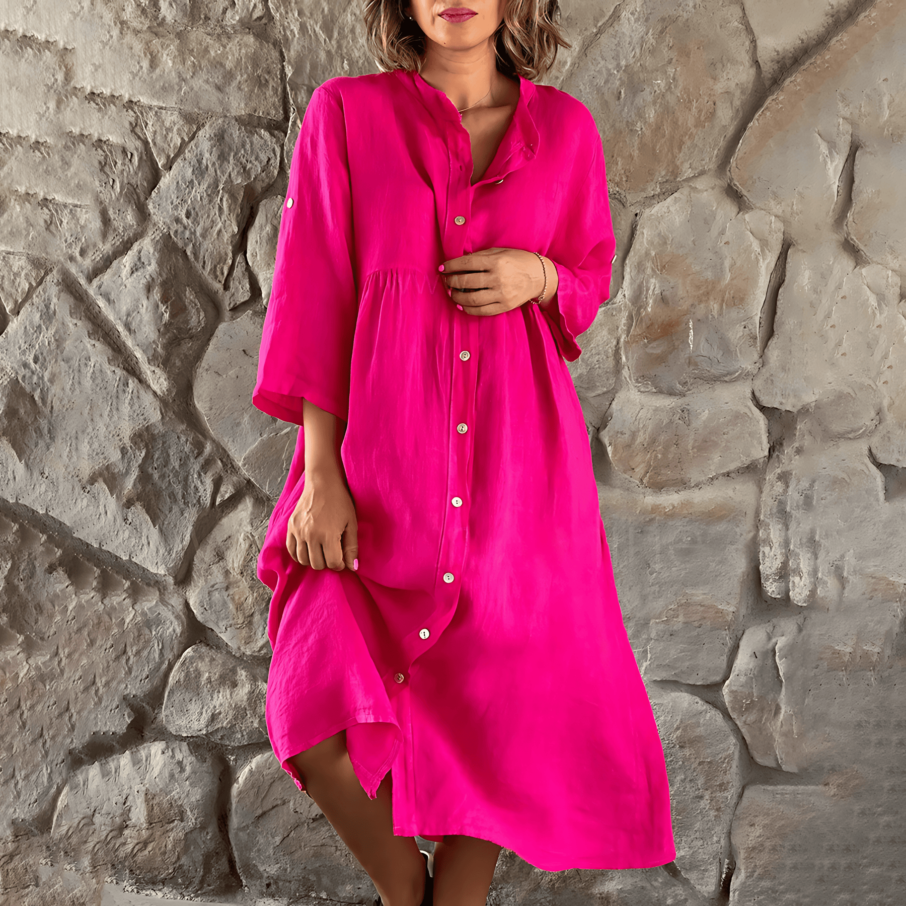 Dieses leichte Sommerkleid vereint stilvolle Details mit maximalem Tragekomfort. Der lockere Schnitt sorgt für ein luftiges Gefühl, während die langen, weiten Ärmel und die durchgehende Knopfleiste dem Design eine raffinierte Note verleihen. Perfekt für entspannte Sommertage oder legere Ausflüge.